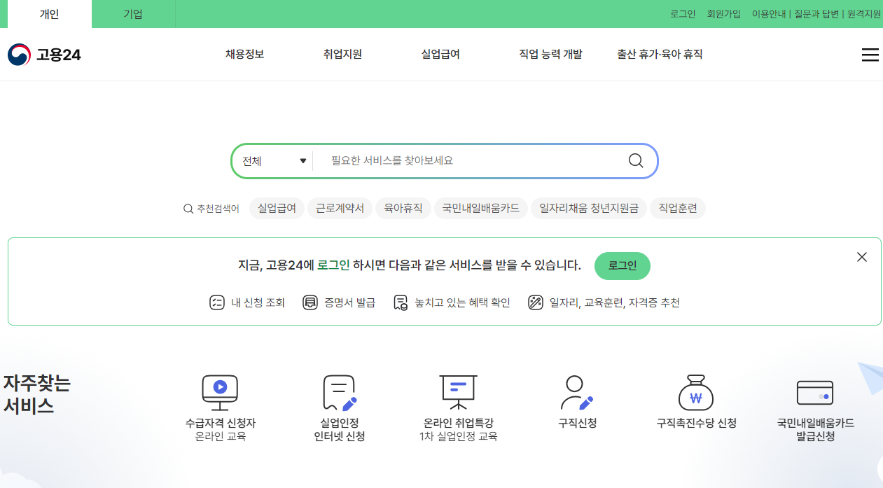 - 고용보험 홈페이지 이용을 위해서는 공인인증서(공동인증서)가 필요할 수 있습니다.